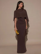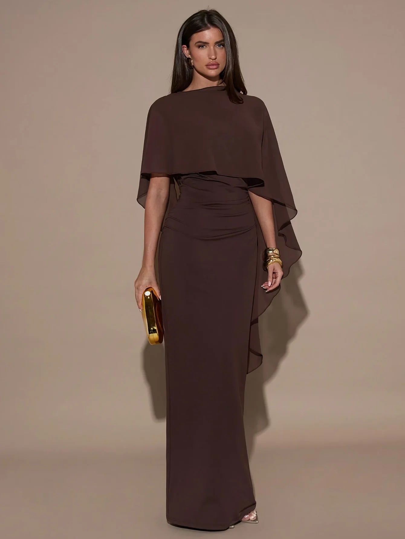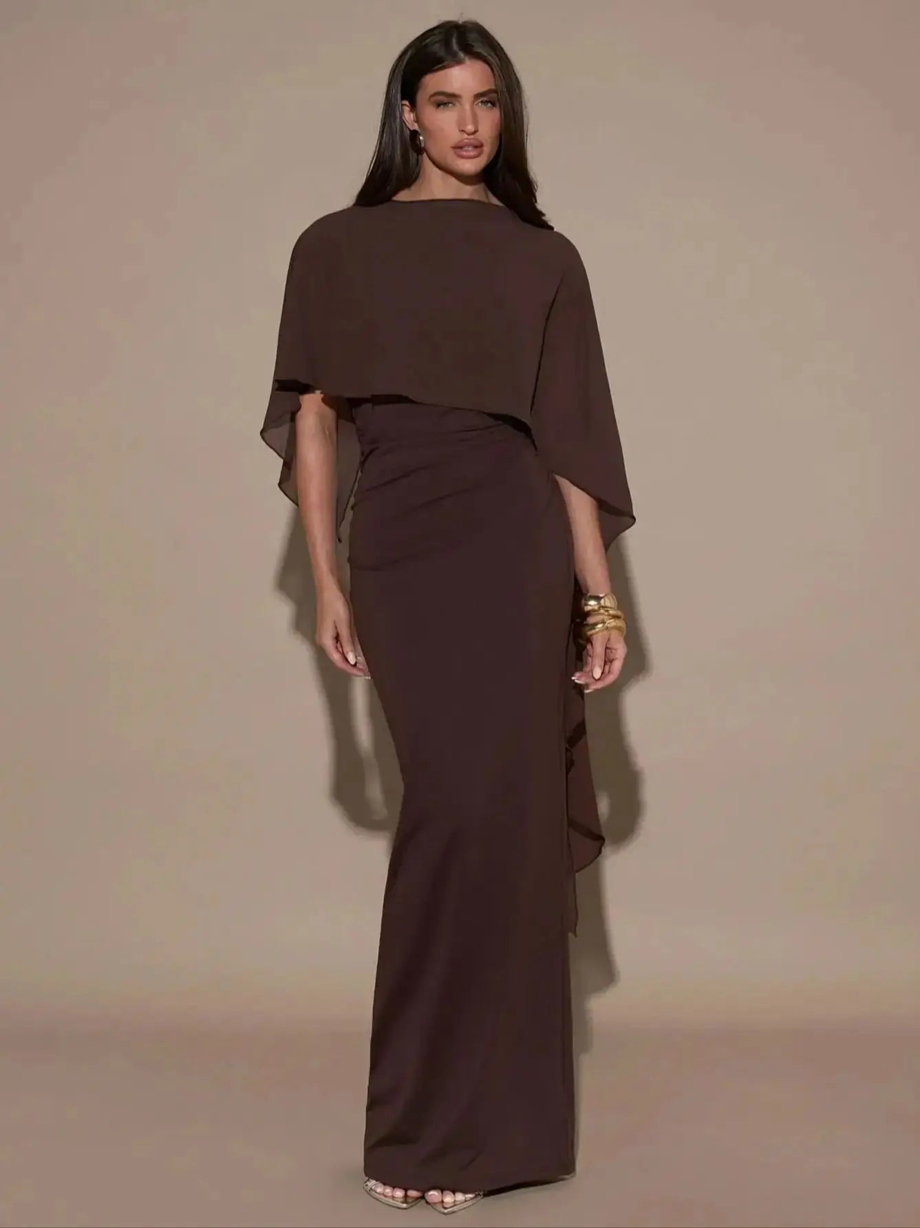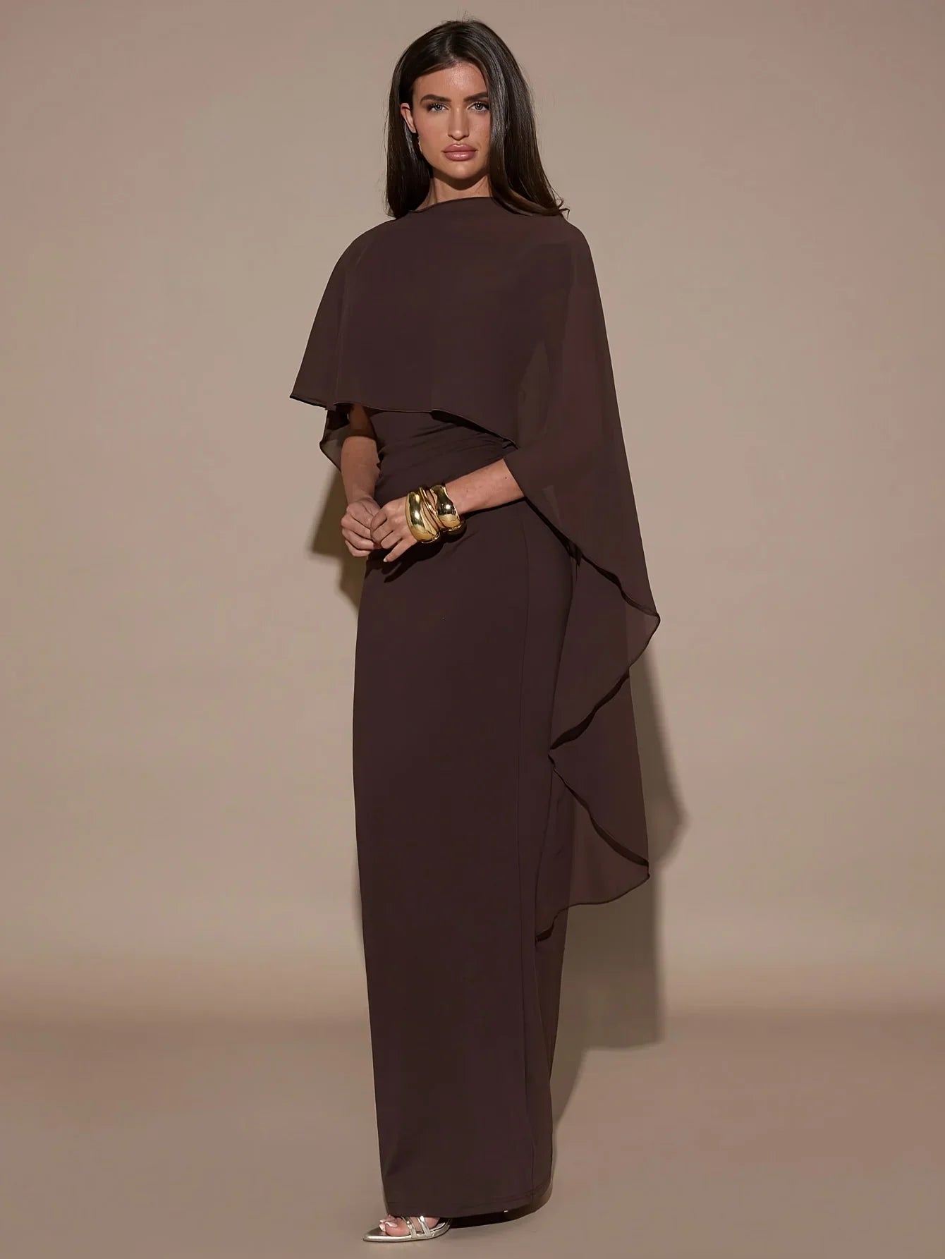 La capa integrada aporta movimiento, distinción y un aire exclusivo que eleva el look al instante, convirtiéndolo en una opción perfecta para eventos, cenas o celebraciones.