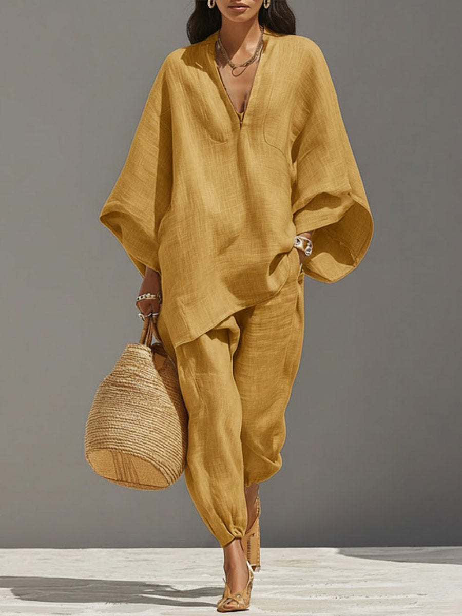 Un conjunto de dos piezas en tono neutro y tejido texturizado, con bajo asimétrico, que ofrece un look sofisticado y relajado para el día a día. Su corte holgado y su diseño fluido aportan comodidad y libertad de movimiento, convirtiéndolo en una opción versátil, elegante y fácil de llevar en cualquier temporada.