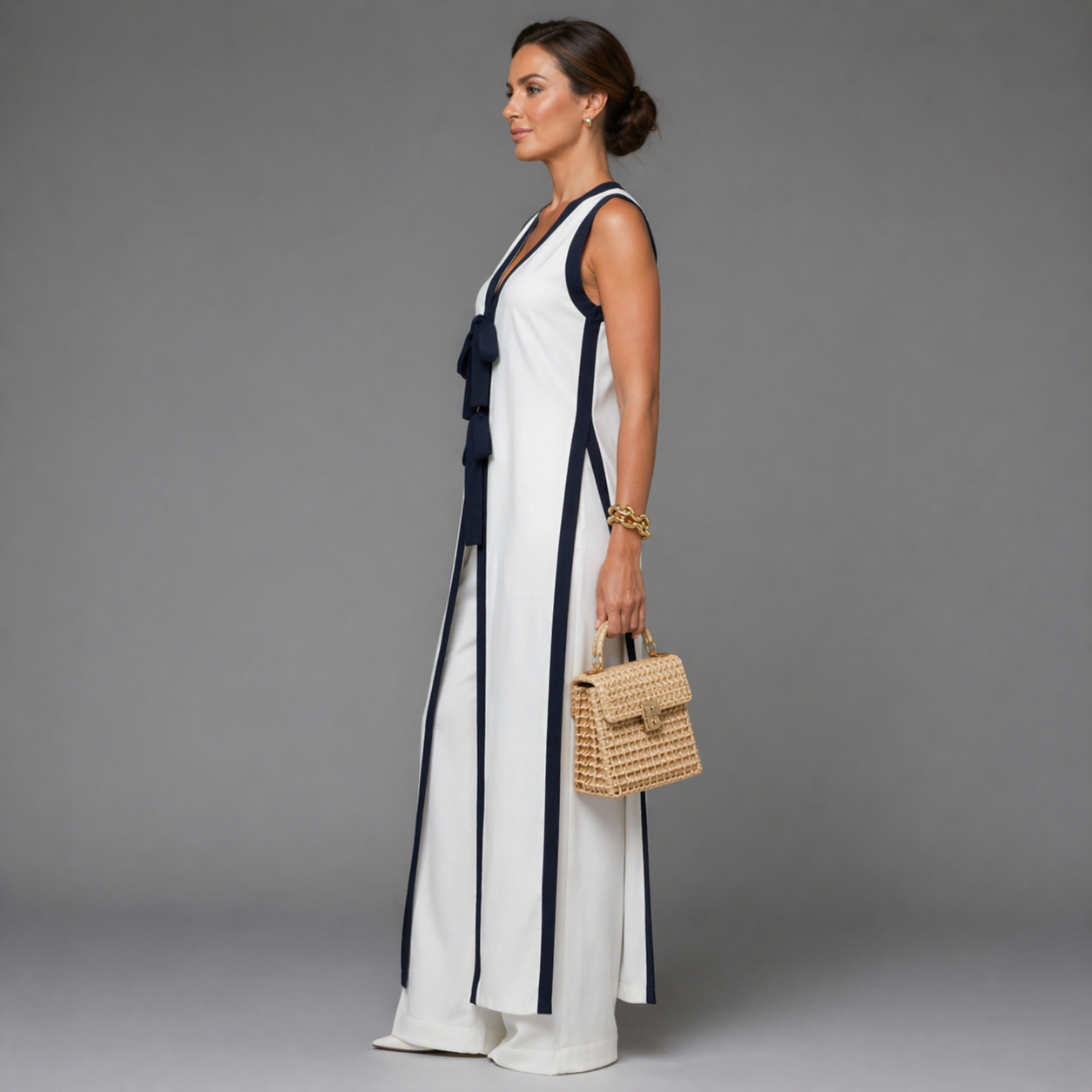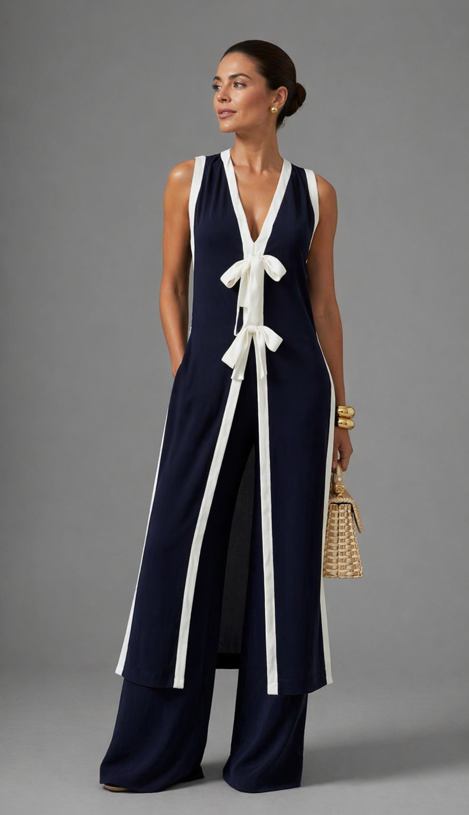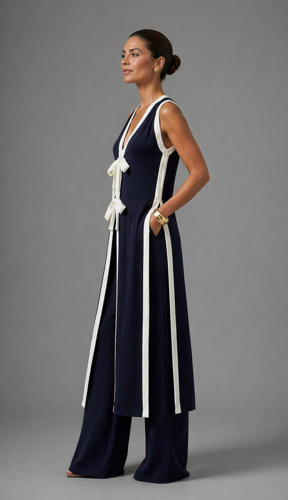 La blusa, de corte largo y recto, destaca por su caída fluida que se extiende casi hasta los tobillos, creando un efecto estilizado y alargado de la silueta. Presenta escote en pico con lazo frontal y detalles en contraste azul marino que recorren el diseño, aportando carácter y distinción. Incluye aberturas laterales y una abertura central en la parte trasera que facilita el movimiento y añade un toque diferencial.