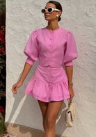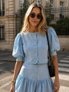 Elegantemente bonita, la blusa perfecta para la nueva temporada con detalles elevados. Con mangas medias abullonadas y botones tacados.
